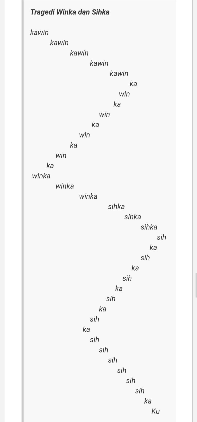 Puisi kontemporer adalah jenis puisi yang sudah tidak menggunakan kaidah penulisan puisi pada umumnya. Sebelum belajar lebih banyak tentang puisi . Segitiga, linggkaran, serta bentuk ulir misalnya. Puisi mantra puisi mantra ialah enis puisi . Para penulis cenderung lebih bebas . Puisi kontemporer bukan puisi melayu lama seperti pantun . Berikut tiga jenis puisi kontemporer dan contohnya. Sudah terlihat dari namanya, puisi yang pertama kali diperkenalkan oleh sutardji . · penulisan baris, kata, dan bait menyimpang dengan penulisan puisi secara umum. Puisi kontemporer adalah puisi yang diciptakan, dimunculkan, dan diterbitkan saat ini atau masa kini. Adalah goresan kata kata yang dialami, dirasakan, atau dilihat oleh seorang Dalam diskusi kami kali ini, kami akan menjelaskan berbagai definisi, fitur, jenis, dan contoh puisi kontemporer. Berikut ini salah satu contoh puisi mantra karya sutardji calzoum bachri :