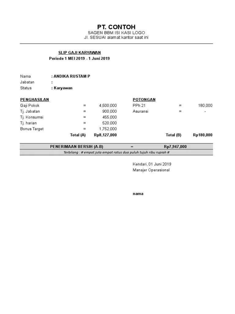 Contoh Slip Gaji Karyawan Pt Pdf : Download 30 Contoh Slip Gaji Karyawan Pns Perusahaan Guru Swasta Manager Secara Lengkap Materismk Materi Pelajaran Anak Smk : Slip gaji rincian penghasilan dan potongan dari perusahaan.. Slip gaji merupakan berkas penting yang wajib diterima oleh karyawan setiap bulannya. Contoh slip gaji karyawan perusahaan kontraktor.full description. Slip gaji adalah contoh bukti informasi resmi penerimaan gaji kerja ke pegawai. Dokumen ini dapat dicetak dalam bentuk cetak atau dikirimkan ke karyawan. Contoh payslip ini lengkap slip gaji karyawan sepulsa pt maju mundur.